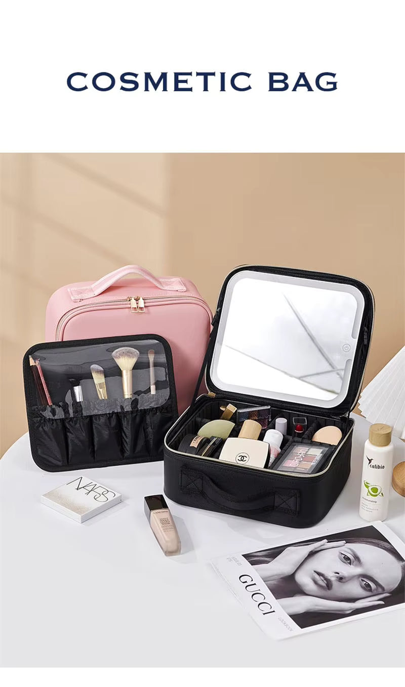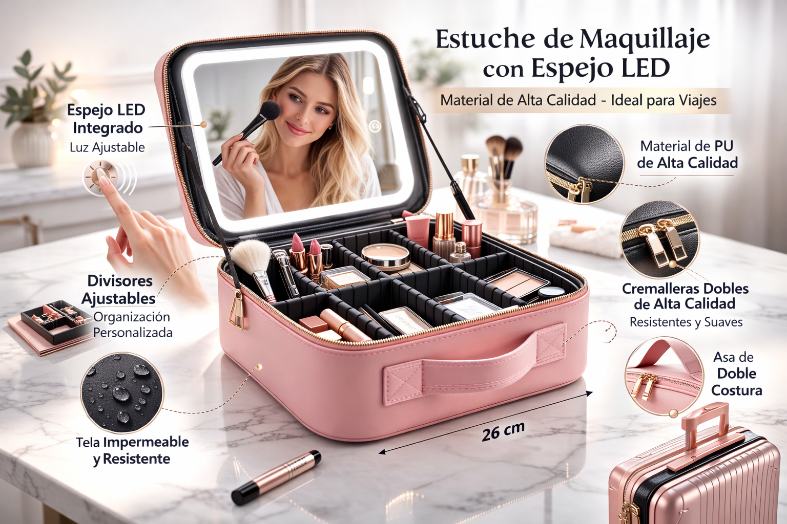 Abres tu organizador. La luz LED se enciende automáticamente. Ves todos tus productos perfectamente acomodados. Eliges tu paleta favorita sin buscar. Te maquillas con luz profesional. Cierras y guardas.